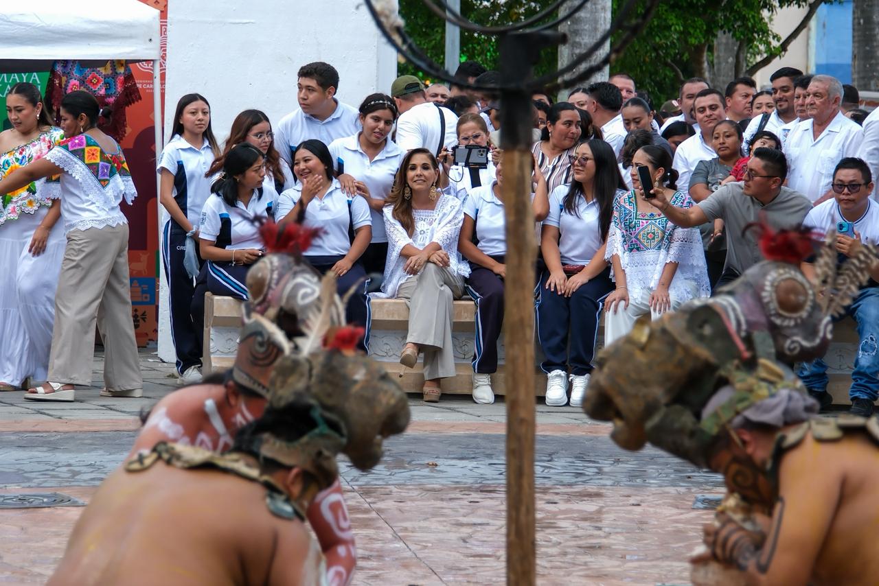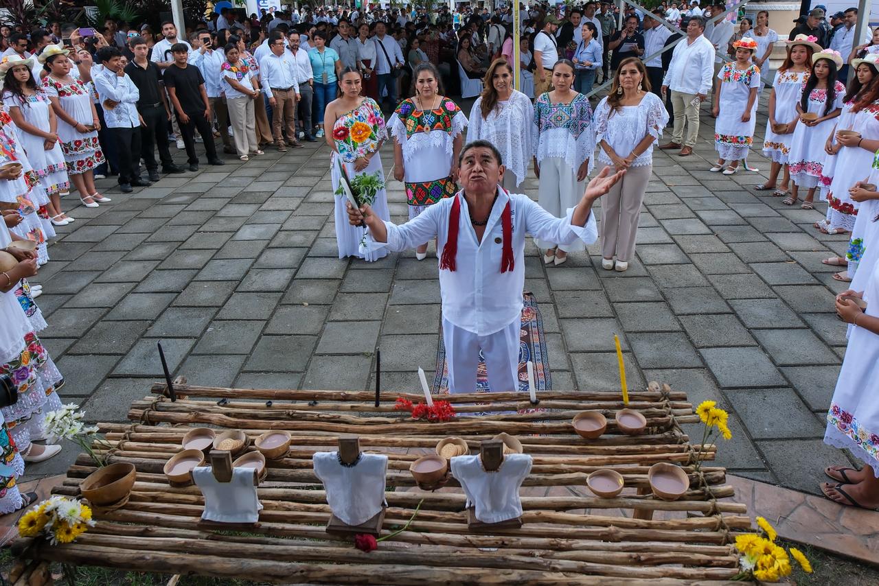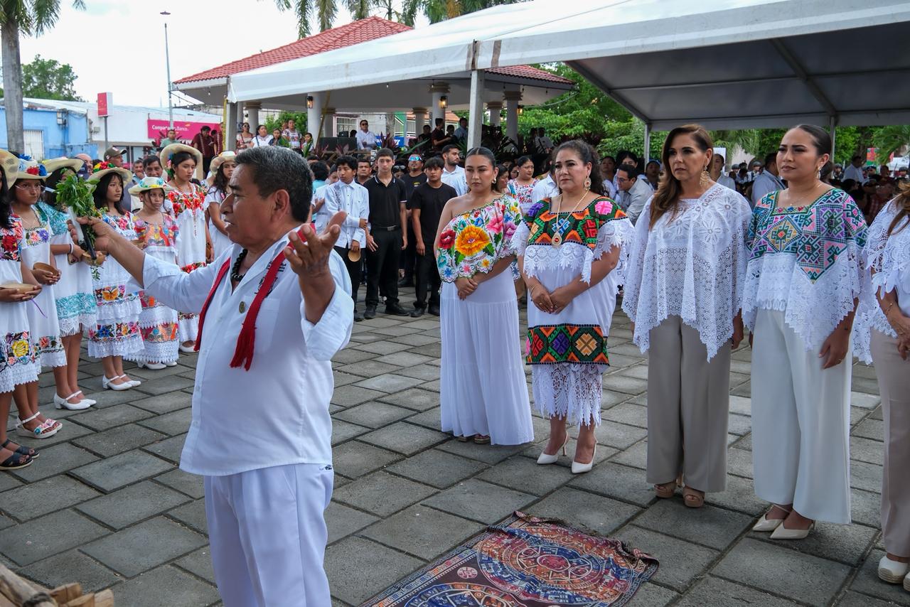Previo a la ceremonia protocolaria, la Gobernadora, acompañada de la presidenta municipal Mary Hernández; de la presidenta honoraria del DIF Quintana Roo, Verónica Lezama Espinosa; del diputado José María Chacón Chablé, en representación de la XVIII Legislatura; de los representantes de las fuerzas armadas, regidoras y regidores, presidentas y presidentes municipales, así como dignatarios mayas, observó una ceremonia maya.
