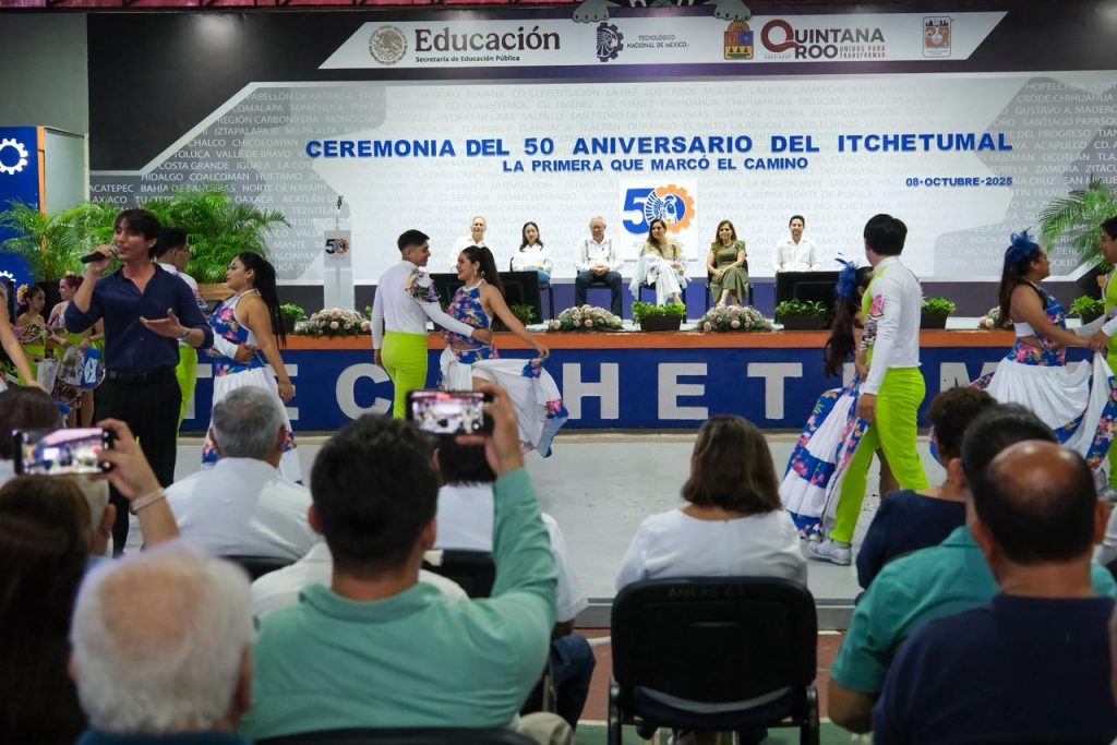 El evento incluyó reconocimientos, presentaciones culturales, corte del pastel con la participación de estudiantes, docentes y egresados, quienes celebraron medio siglo de historia y reafirmaron su compromiso con la transformación y el bienestar de Quintana Roo.