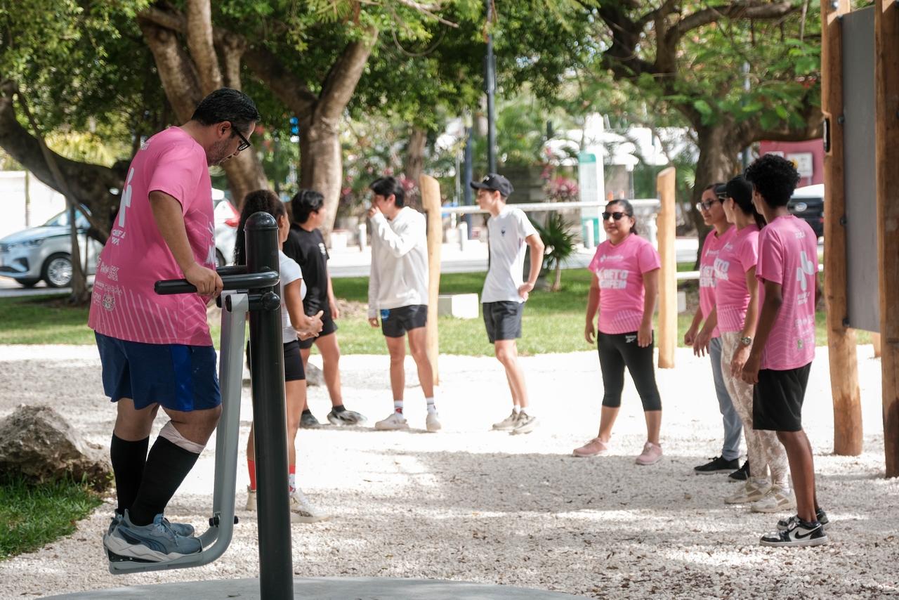 El espacio, ubicado en el camellón central frente a la fuente Kukulkán, en el llamado Kilómetro 0 de la zona hotelera de Cancún, cuenta ahora con pasamanos, barras, equipos elípticos y estaciones de ejercicio, todo con código QR que, al escanearlos, los usuarios pueden acceder a rutinas específicas y conocer qué músculos se trabajan en cada aparato.