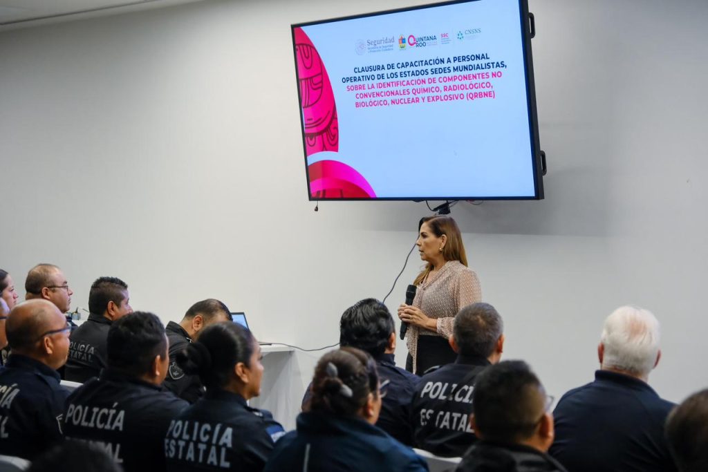 Cancún.- “Somos un gobierno que no improvisa, trabajamos de la mano del gobierno federal, de la Presidenta Claudia Sheinbaum; del secretario de Seguridad y Protección Ciudadana, Omar García Harfuch, y de las fuerzas armadas”, expresó la gobernadora Mara Lezama al encabezar la clausura de la capacitación especializada en identificación de componentes no convencionales (QRBNE), en el complejo C5 de Cancún.