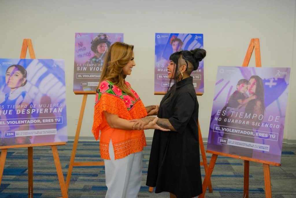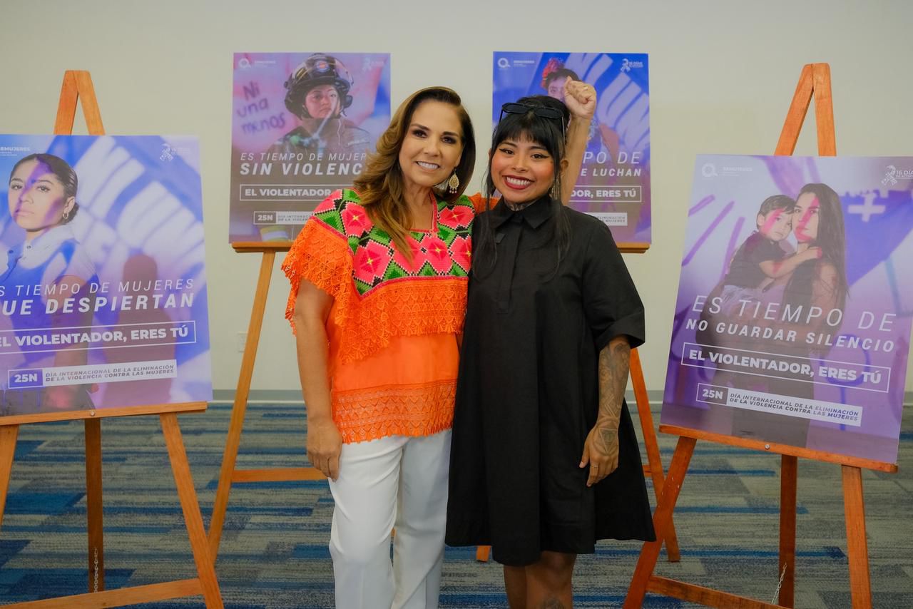 Cancún.- Acompañada de Bere Delirios, una de las voces más poderosas del hip-hop contemporáneo con el nombre artístico KillB3at y compositora de la canción “Es tiempo de mujeres”, la gobernadora Mara Lezama Espinosa presentó la campaña “El violentador eres tú”, en el marco del Día Internacional de la Eliminación de la Violencia contra la Mujer, en el que dejó en claro que en Quintana Roo hay cero tolerancia a la violencia contra las mujeres.