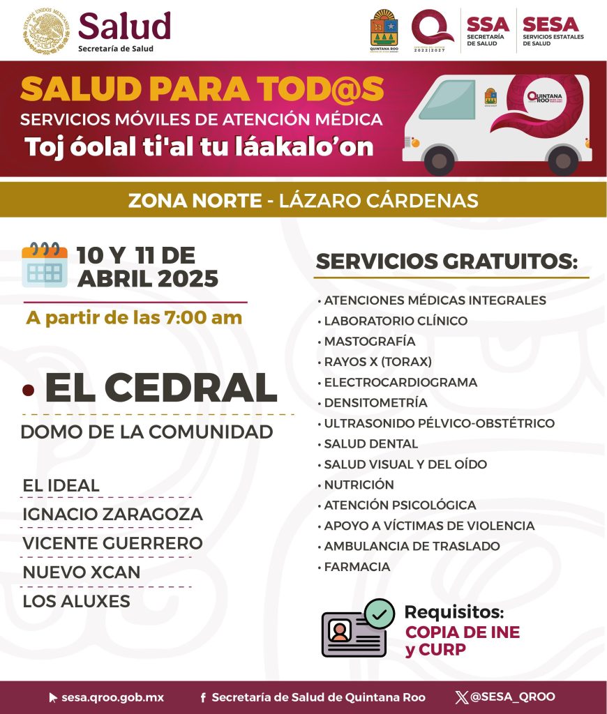 -Los servicios médicos, gratuitos, oportunos e integrales estarán disponibles del 7 al 11 de abril de 2025 para la población de estos municipios