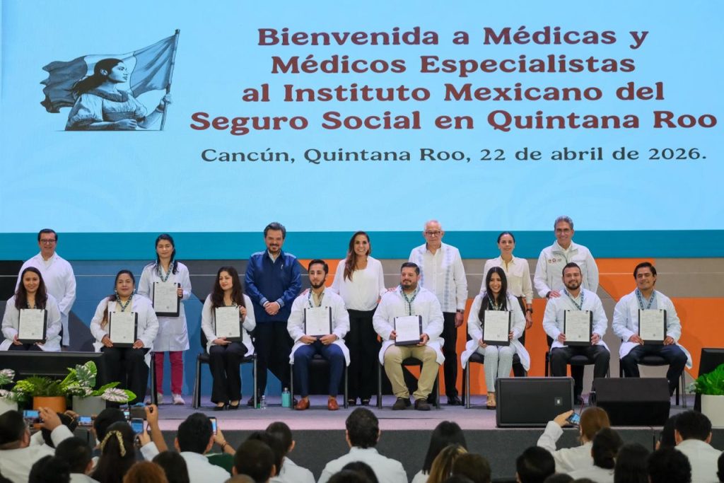 Cancún.- Con la presencia del director general del Instituto Mexicano del Seguro Social (IMSS), Zoé Robledo Aburto, la gobernadora Mara Lezama Espinosa encabezó la ceremonia de bienvenida de 123 médicas y médicos especialistas que se integran al Instituto en Quintana Roo, como parte del histórico fortalecimiento del sistema de salud en la entidad.