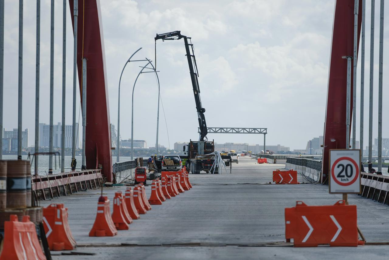 La Gobernadora explicó que el Puente Nichupté registra un avance del 98.5 por ciento en el entronque Colosio, 98.3 por ciento en la zona terrestre, 95.6 por ciento en el gran arco metálico, 91.8 por ciento en la zona lagunar y 79.3 por ciento en el entronque del bulevar Kukulcán.