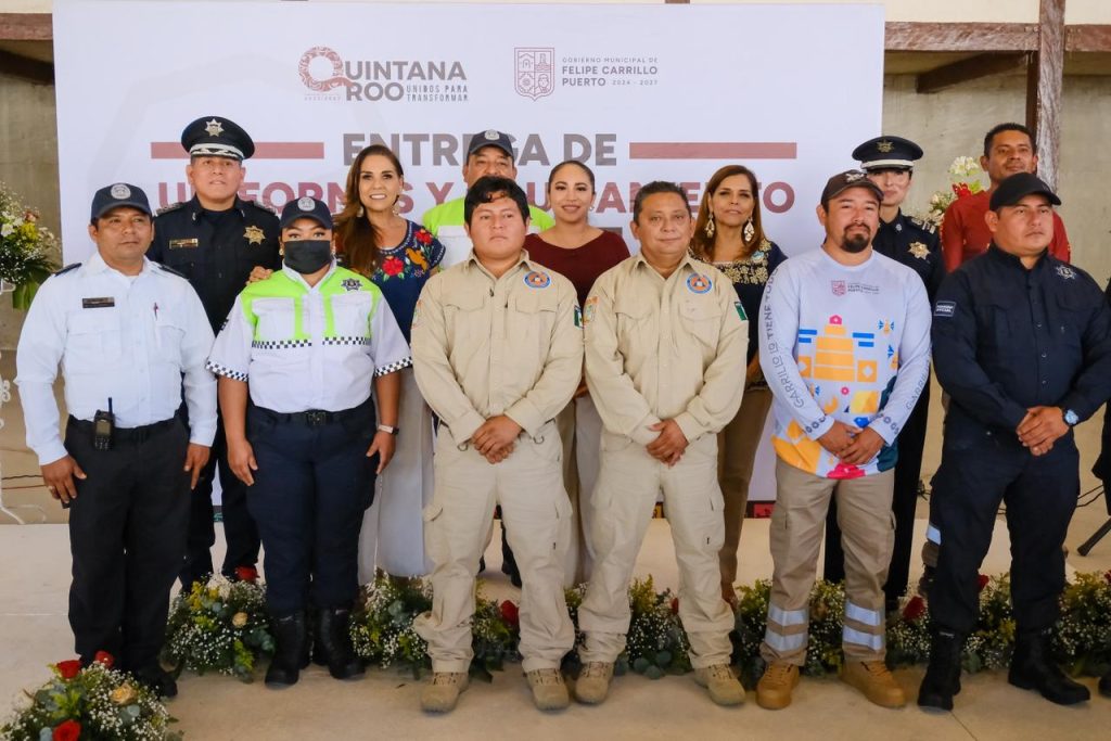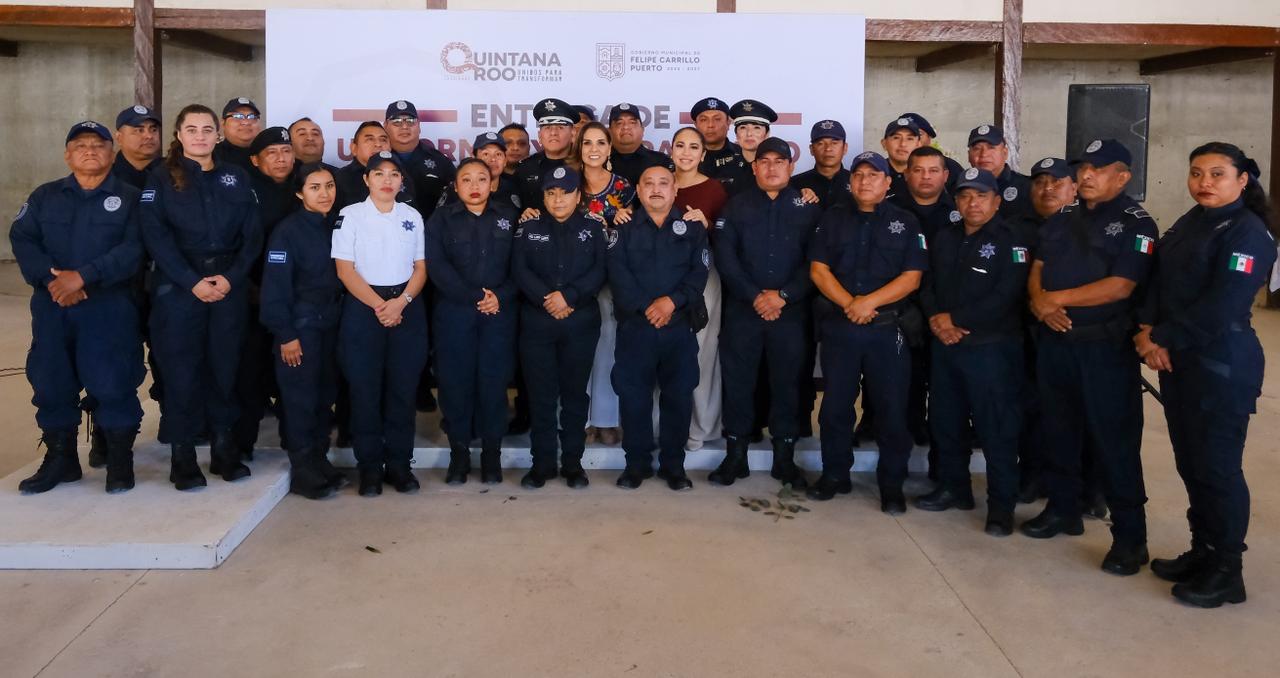 Felipe Carrillo Puerto.- La gobernadora Mara Lezama Espinosa acompañó a la presidenta municipal de Felipe Carrillo Puerto, Mary Hernández, en la entrega de uniformes al personal operativo de Seguridad Pública, Tránsito y Bomberos del municipio, como parte de las acciones para fortalecer la dignidad y profesionalización del servicio público.